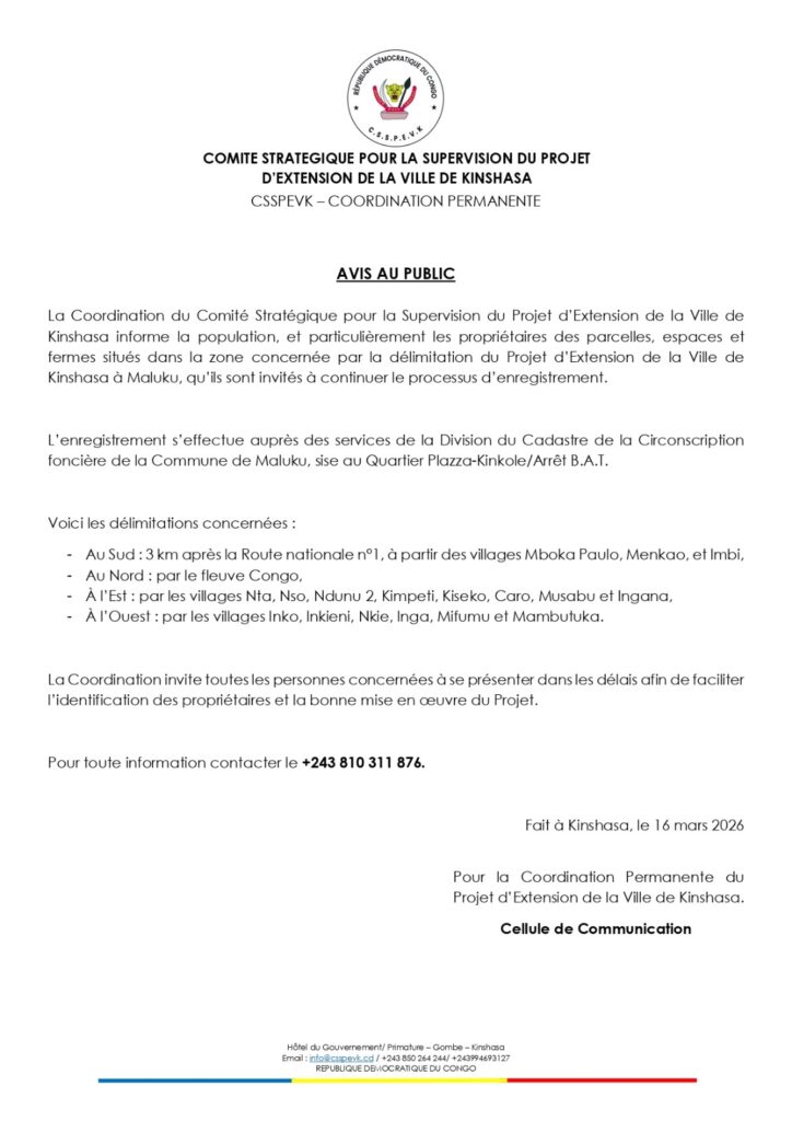 Projet d’extension de Kinshasa : les propriétaires fonciers de Maluku appelés à poursuivre l’enregistrement de leurs parcelles, espaces et fermes